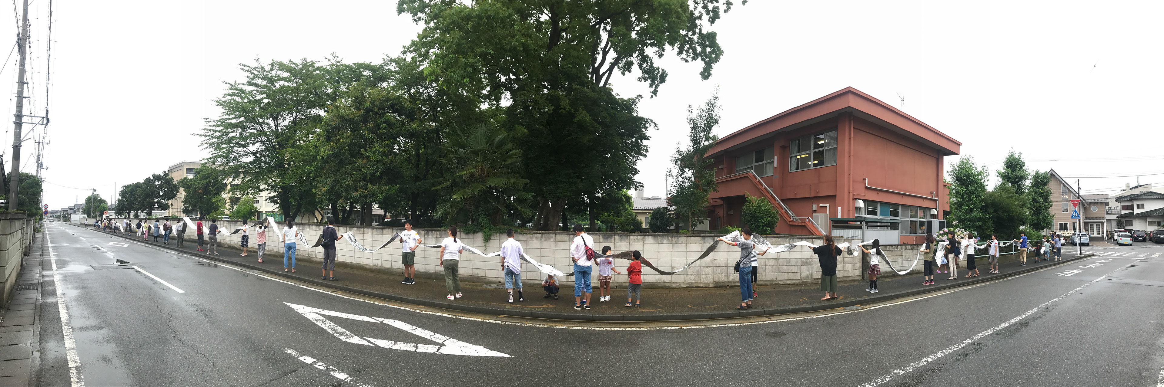 公民館の部屋(トップ画像右上のオレンジ色の建物2階部分)をスタートし、階段を降り、先頭が玄関からも出てしまっても、ロール本体はまだ最初の部屋にある。「ちぎれないように」100m出してみるのが目標なので、突っ走る先頭チームは外での待機時間が長くなるし、後ろと前ではお互いがどんな状況かは分からない。伝言ゲーム方式で状況を伝え合い、隣の人とのペースを合わせ、ちぎれないように声を掛け合い、ということが自然と起こった。先頭チームのアイデアで全部まっすぐにしてみたいということになり、敷地では足りなそうなので、隣接する小学校の塀沿いに出てみることになった。(ついついワークショップ会場を飛び出して、公道に出てしまう癖がある気がします。)きっとリスクアセスメントの視点で言えば、おいおいと思っている大人もいることだろうなと、頭の片隅では分かってはいるんですが、危ないからできない、というのは好ましくないと思う。できるか、できないかではなくて、どうやったらできるか、というのを考えるのが大事。それを瞬時に判断して、安全に楽しく過ごせるように体制を組み直してくれるスタッフさんがいて初めてできること。いつも多くの方にそうやって支えてもらって、自由度の高さが保てる訳です。ありがたい。